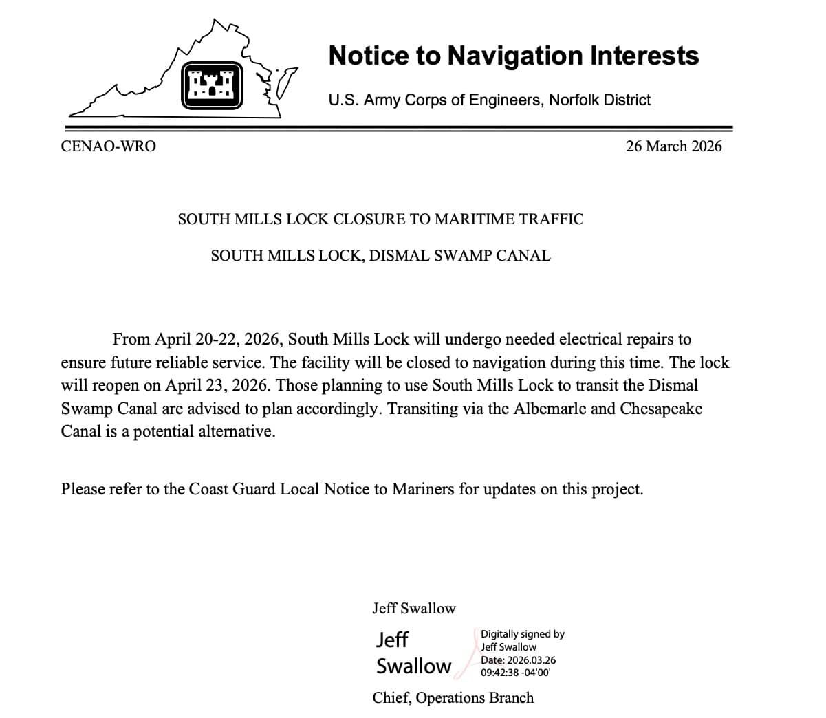 Here are the latest Local Notices to Mariners and NAV ALERTS that are relevant to ICW cruising in Districts 5, 7 and 8, the OBX, AICW, OWW, Keys, GIWW and adjacent waters. Open each LNM link for the USCG notice and a chart for each location. Listed north to south to north. NAV ALERTS will also be posted on our Homepage.