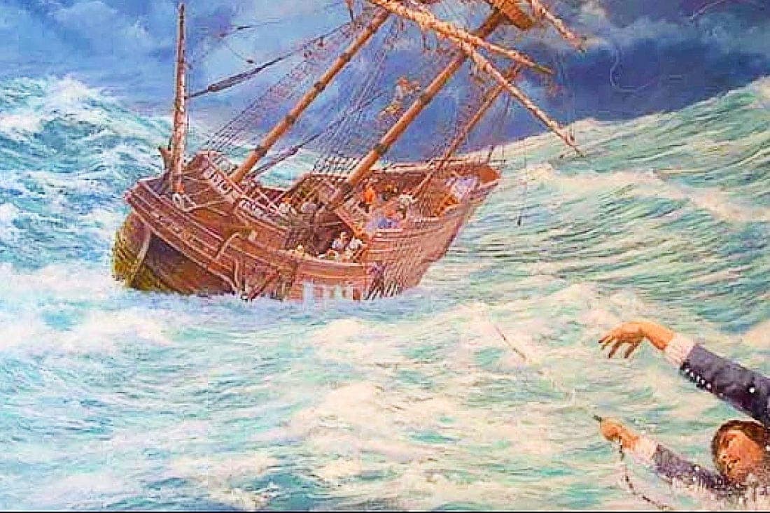 Below decks, the Mayflower was foul from the stench of 102 human bodies, especially when everyone huddled inside during a fierce storm. Howland decided it would be a good idea to go on deck for some fresh air, and found himself tossed into the raging North Atlantic ocean on a leeward roll of the ship a’hull.