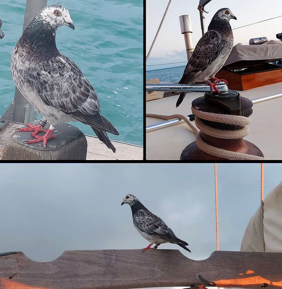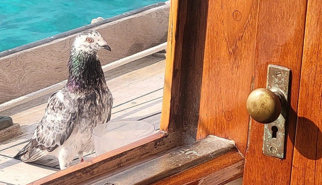 This homing pigeon, wearing a band that signifies he’s from Japan, has chosen to live aboard Steadfast, an old wooden yacht in the Bahamas. (All photos courtesy of Steadfast and its Facebook page)