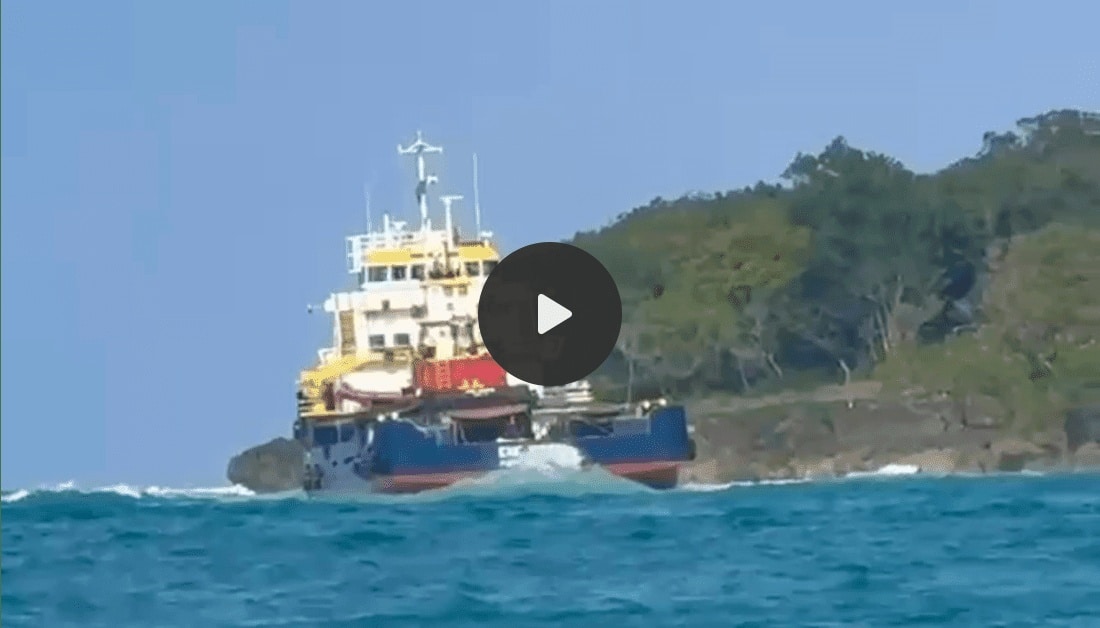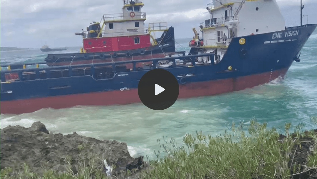 According to witnesses, two tugboats arrived and tried to tow ENE Vision into deeper water, but that didn’t work; the ropes broke. A RoRo vessel also arrived to help, but it’s not clear what went on with that. ENE Vision was still on the rocks at the end of the day yesterday.