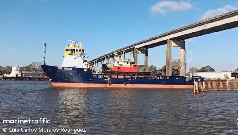 Here is an image on MarineTraffic showing ENE Vision leaving the Amelia Shipyard in Louisiana earlier this month with a tug on her aft deck.