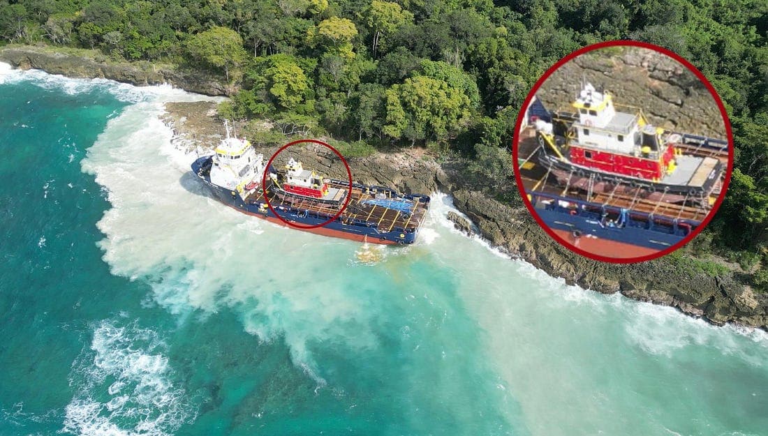 ENE Vision was pushed up against the rocky shore at the entrance to Luperon Harbor in the Dominican Republic. Before her plight had become this extreme, the barge she was towing was detached and towed inside by local boats. (Photo by Davy Ashcroft)