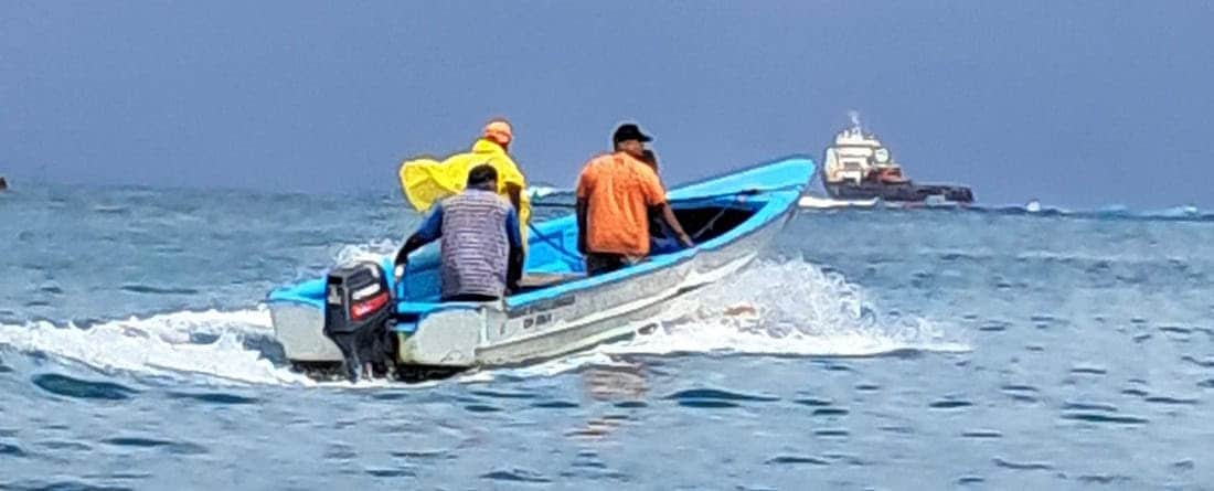 A yola with harbor personnel rushes to the grounded ship. (Photo by David Herrera of SV Oniwa)